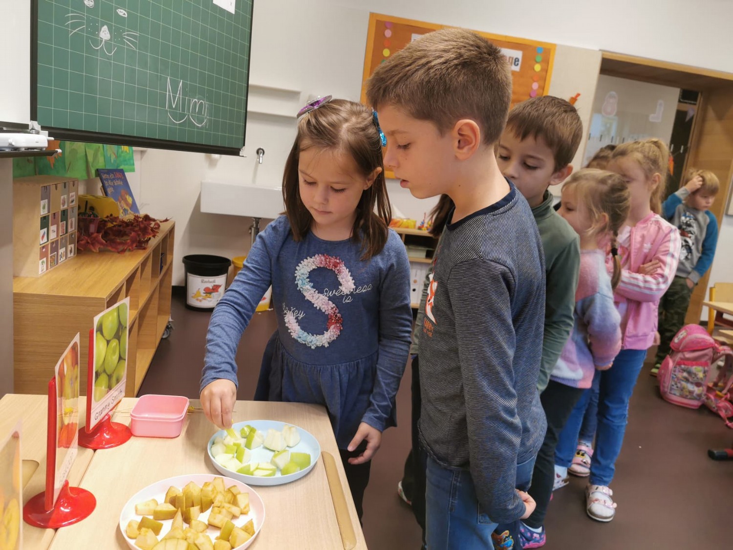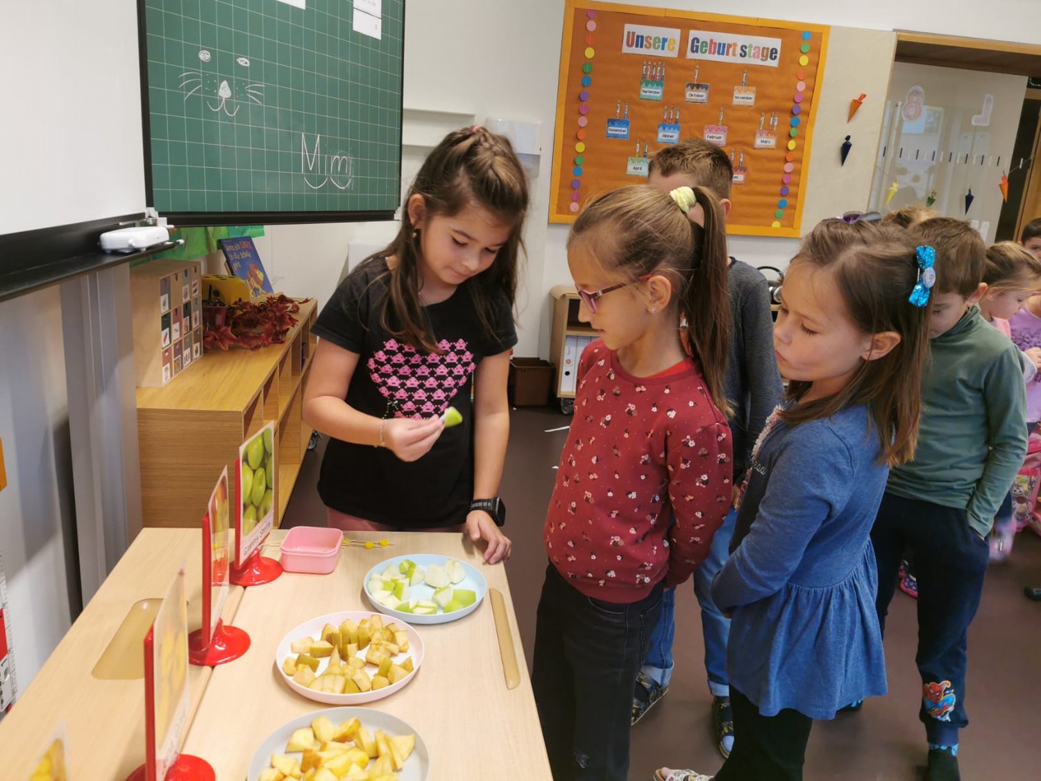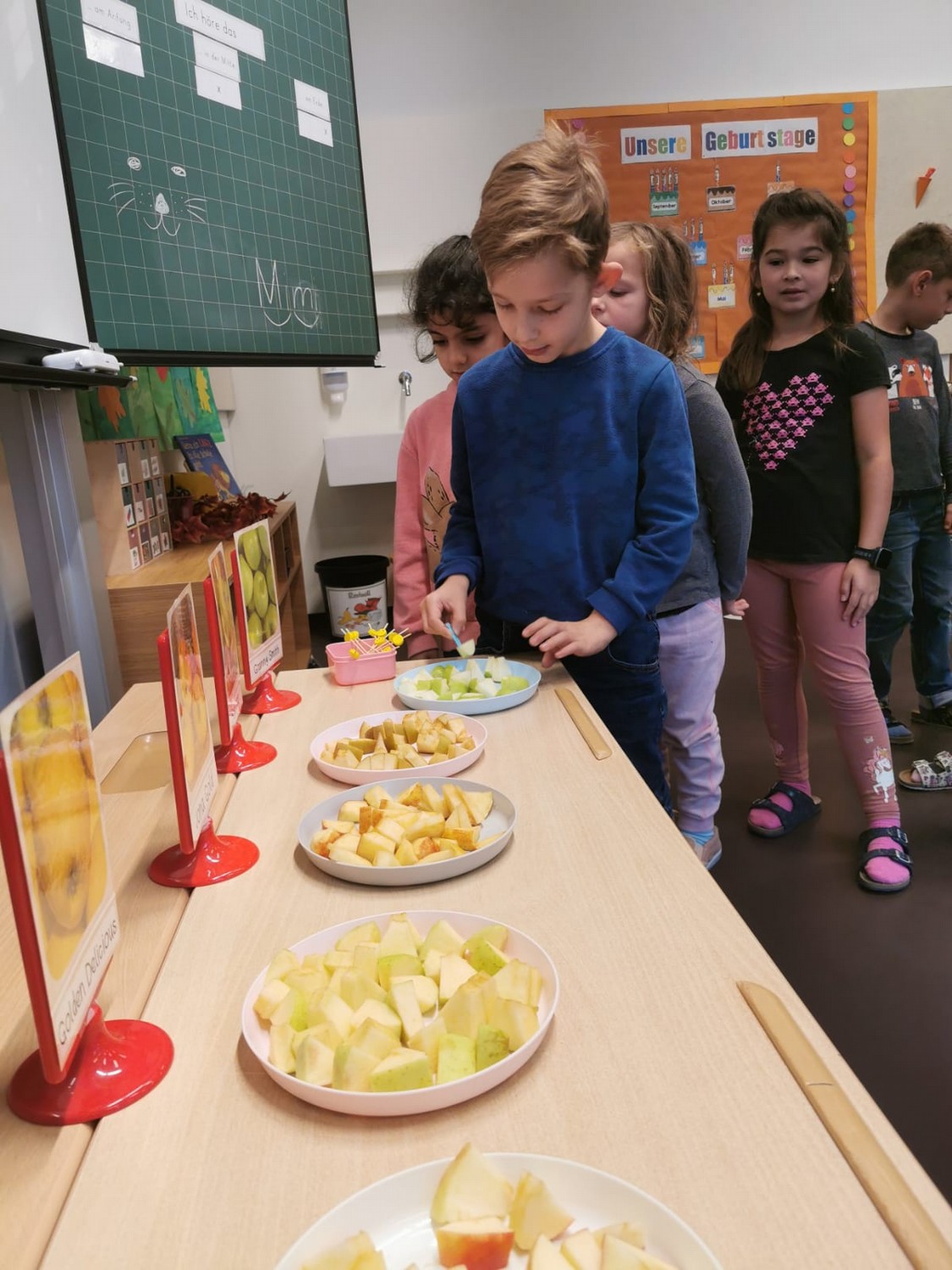 Die Kinder der 1.a Klasse verkosteten unterschiedliche Apfelsorten.