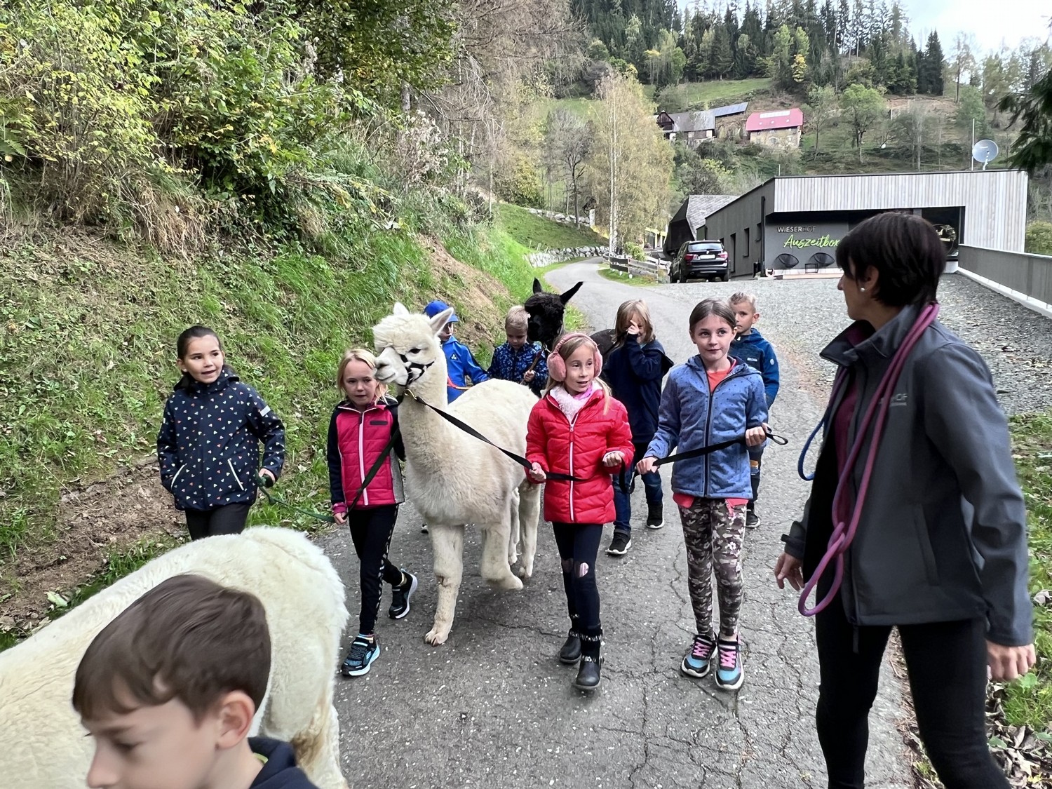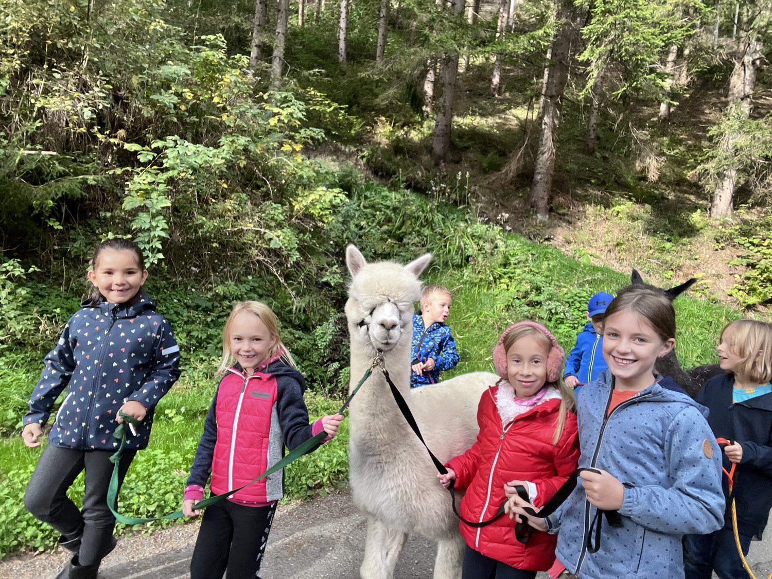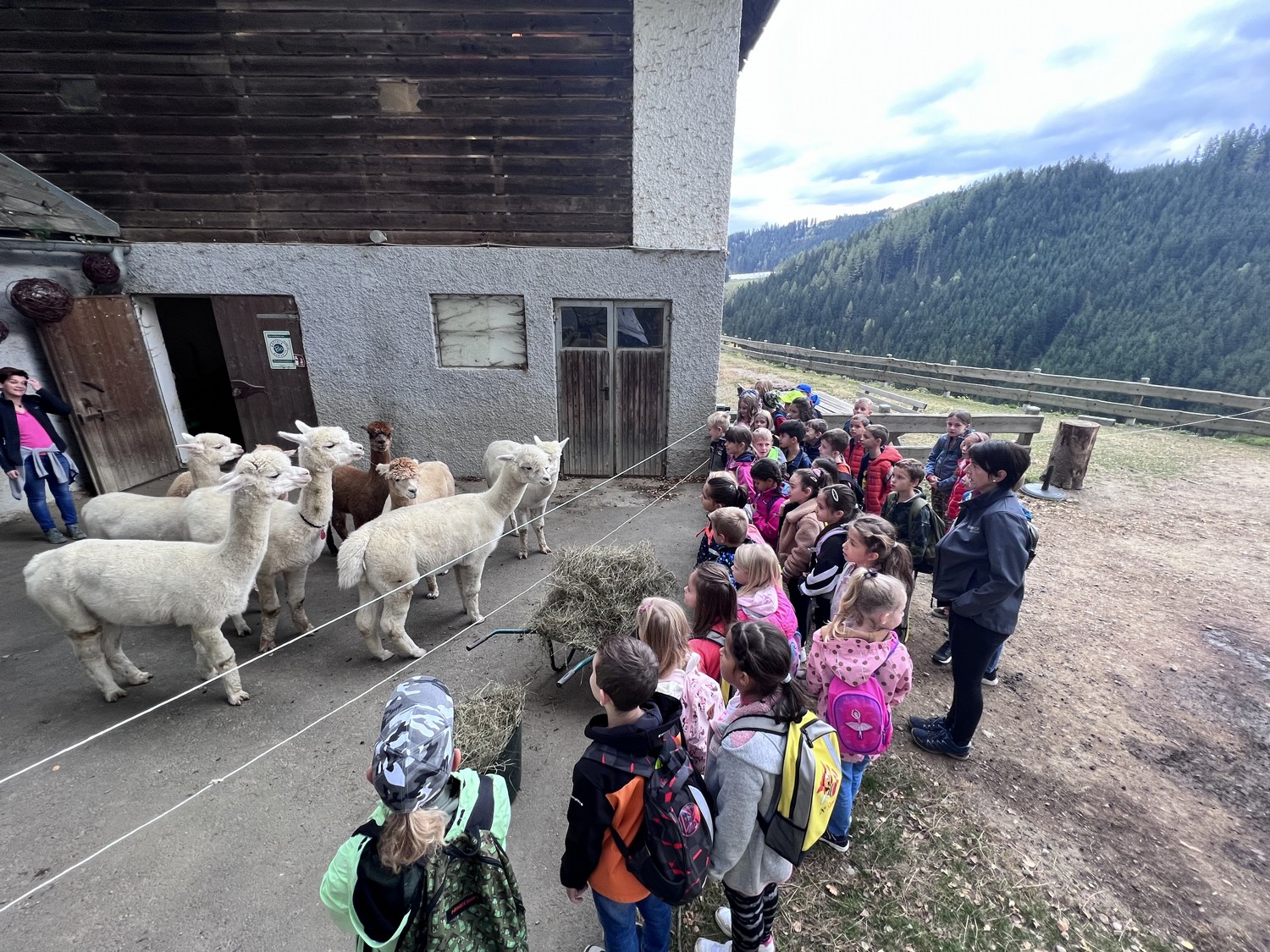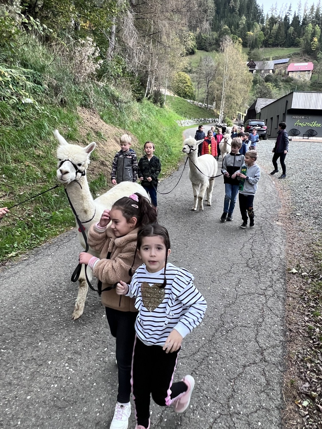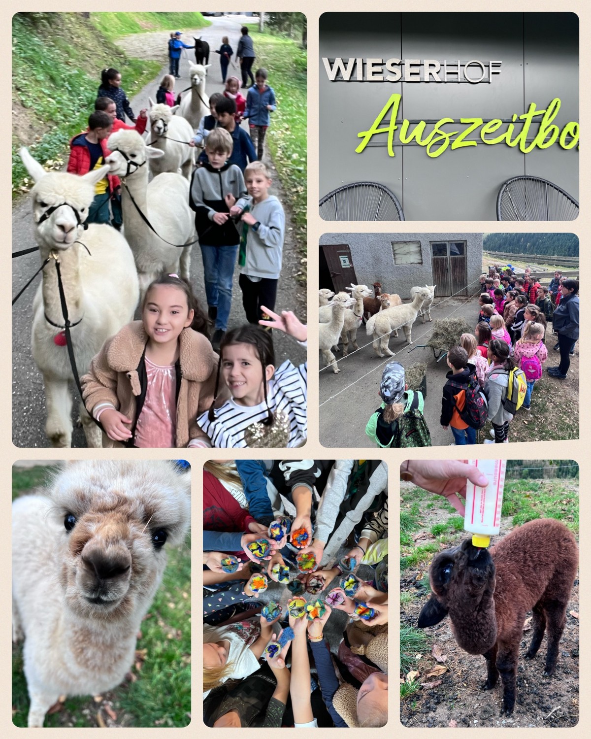 Die 2. Klassen besuchten die Alpakas am Wieserhof und durften viele neue Erlebnisse sammeln. Erst wurden die Alpakas gefüttert, danach für einen Spaziergang "aufgezäumt", spazieren geführt, gemeinsam gejausnet und zum Abschluss im Heu gehüpft und mit der Wolle der Alpakas Blüten gefilzt.
