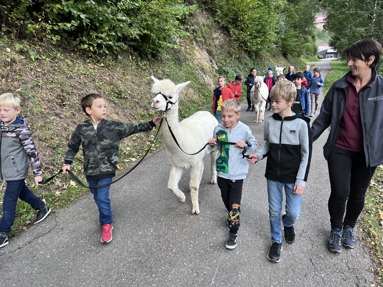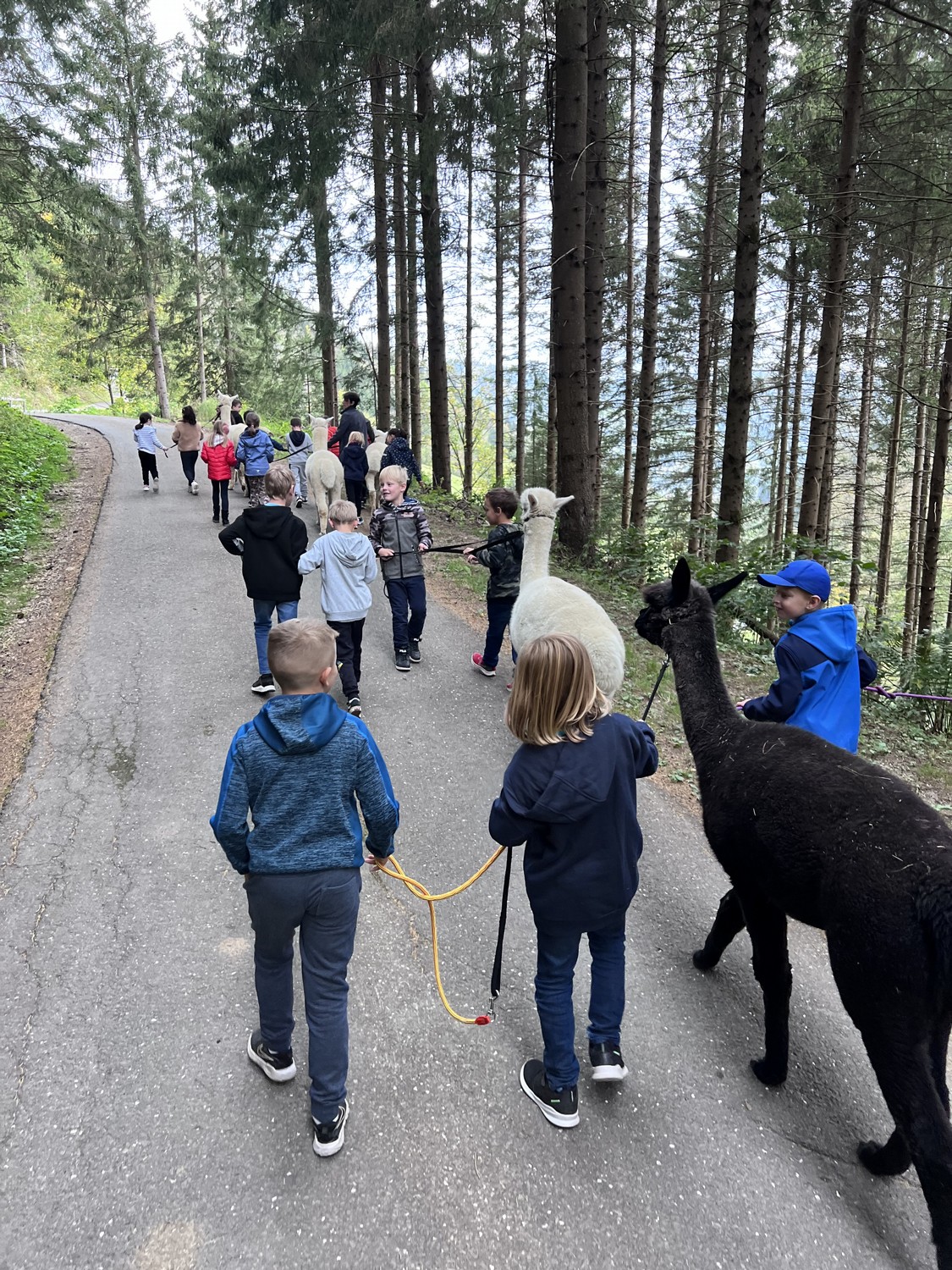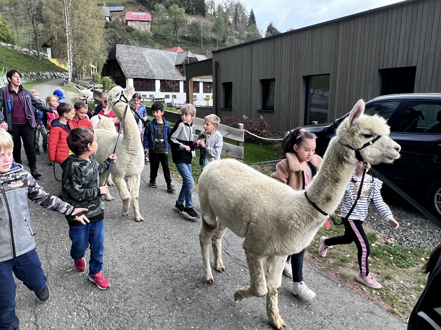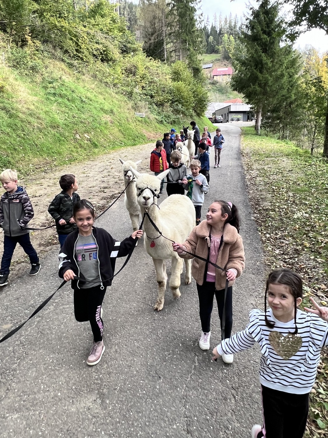 Die 2. Klassen besuchten die Alpakas am Wieserhof und durften viele neue Erlebnisse sammeln. Erst wurden die Alpakas gefüttert, danach für einen Spaziergang "aufgezäumt", spazieren geführt, gemeinsam gejausnet und zum Abschluss im Heu gehüpft und mit der Wolle der Alpakas Blüten gefilzt.