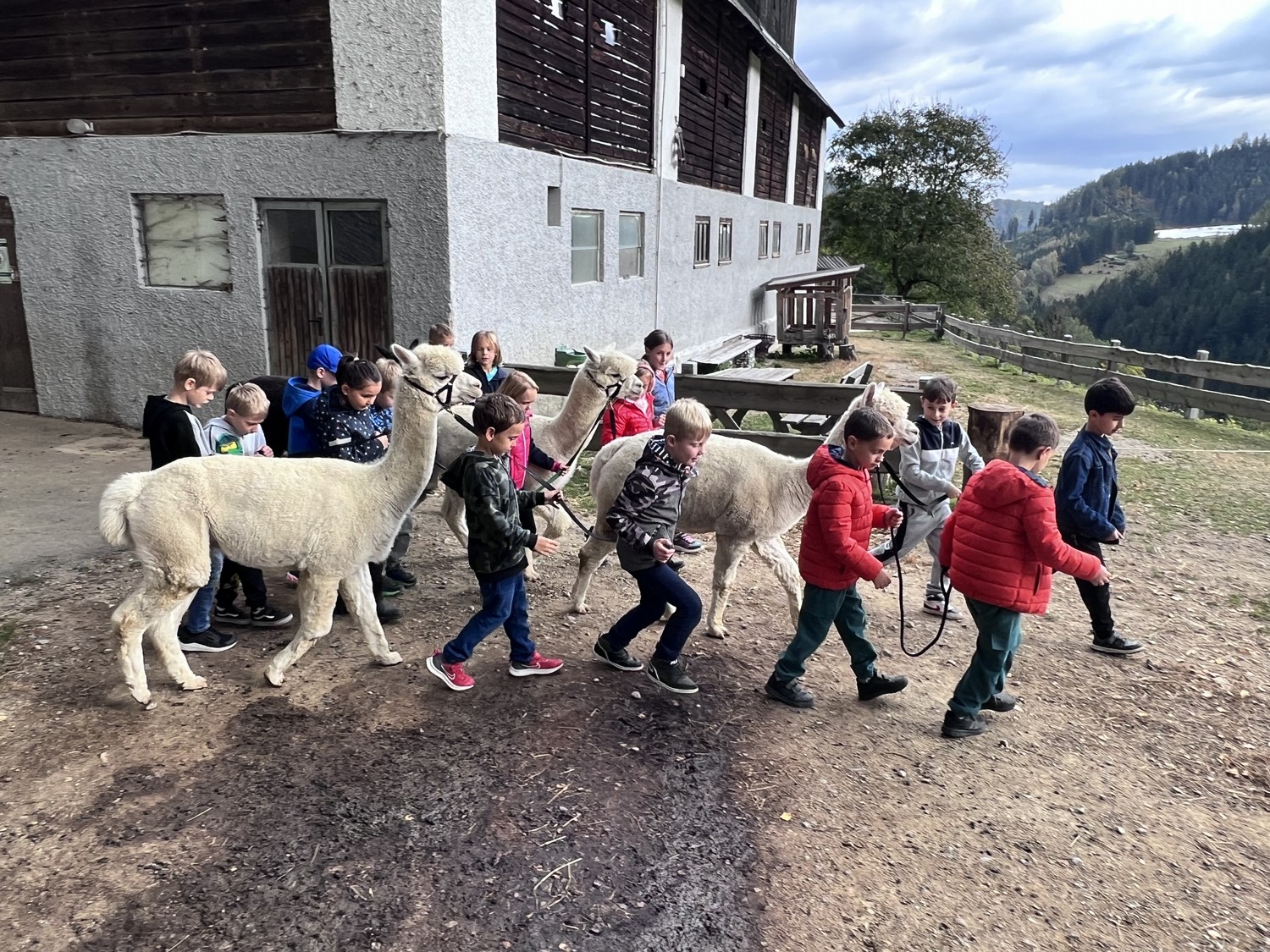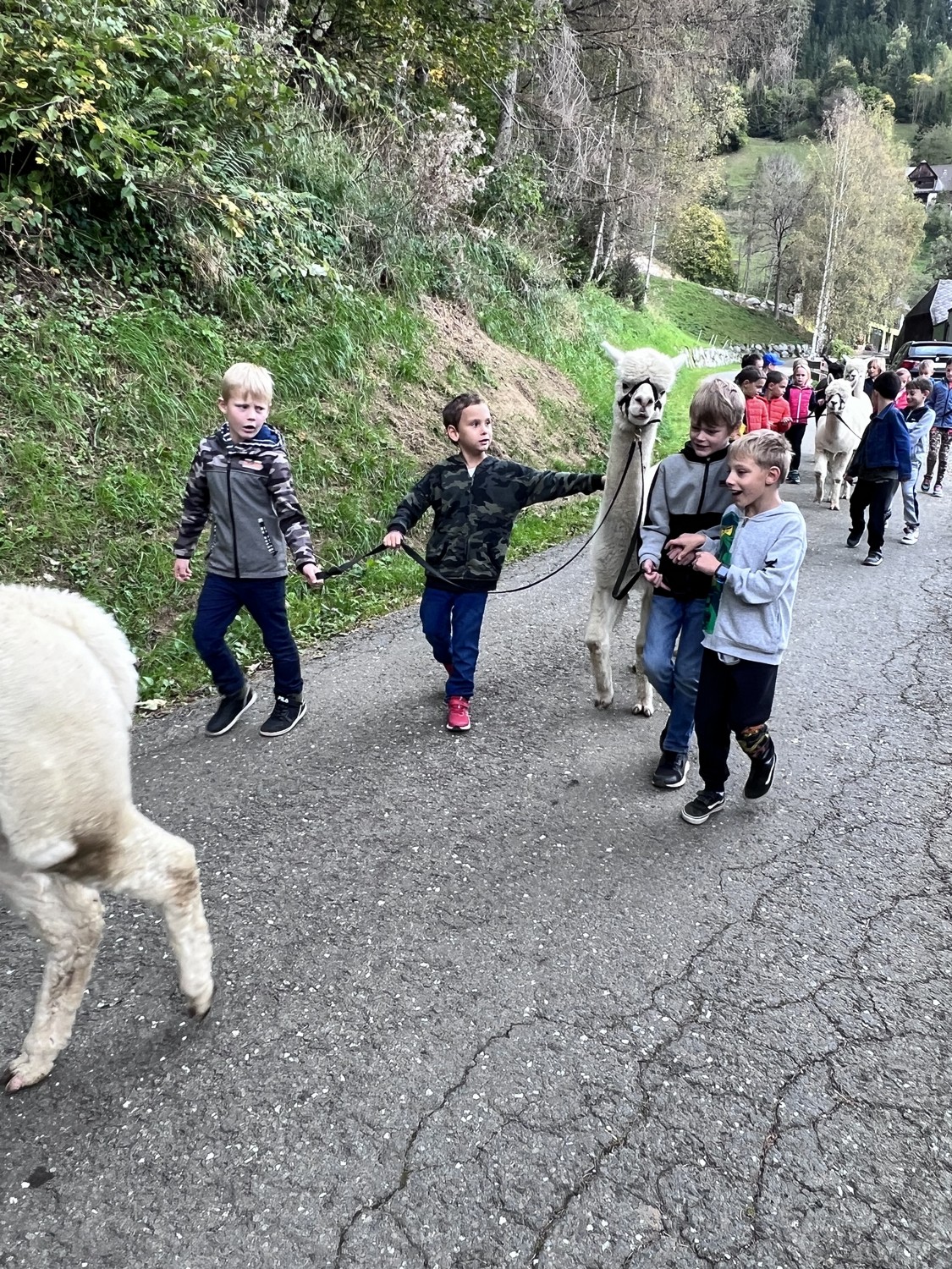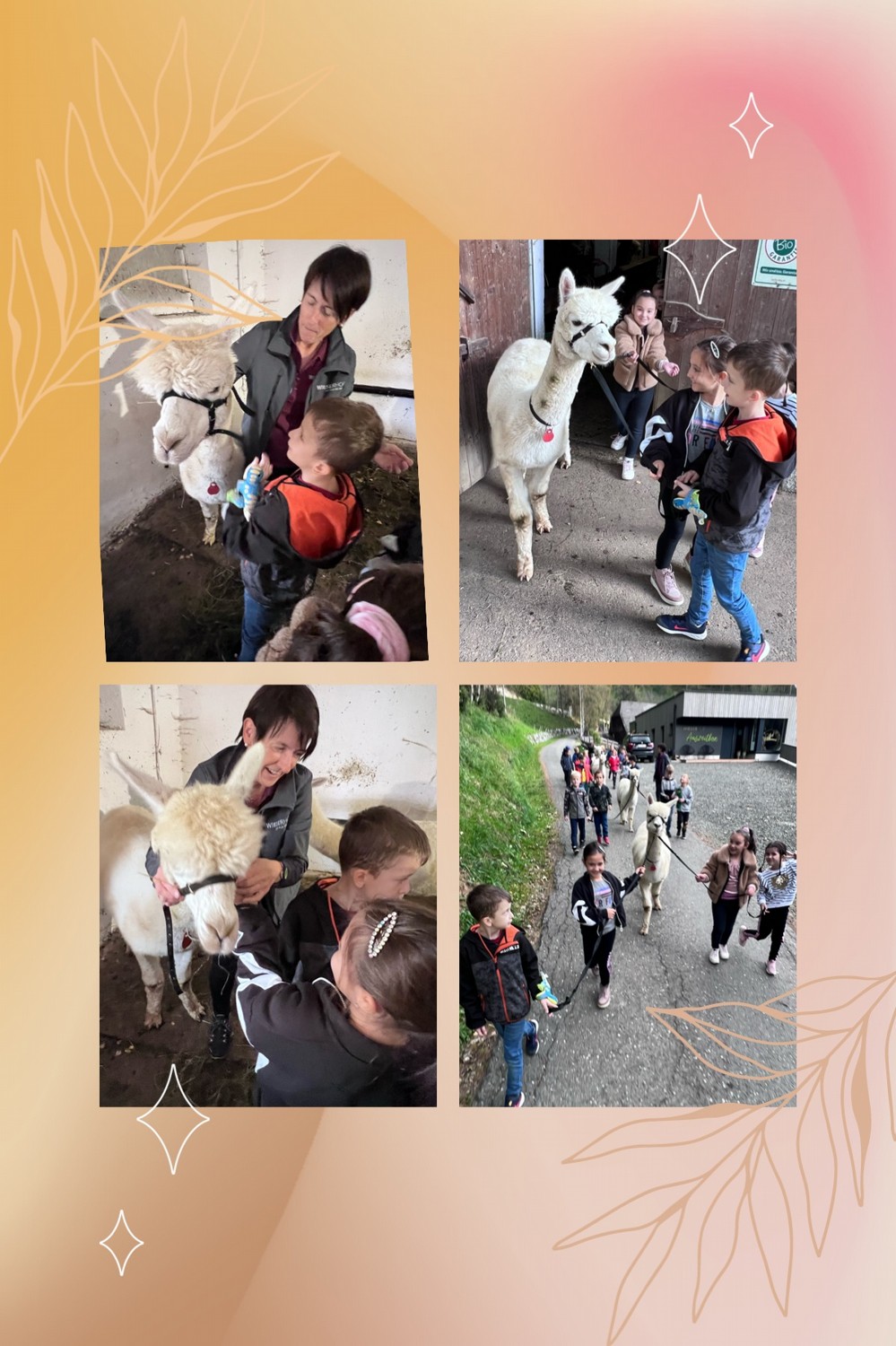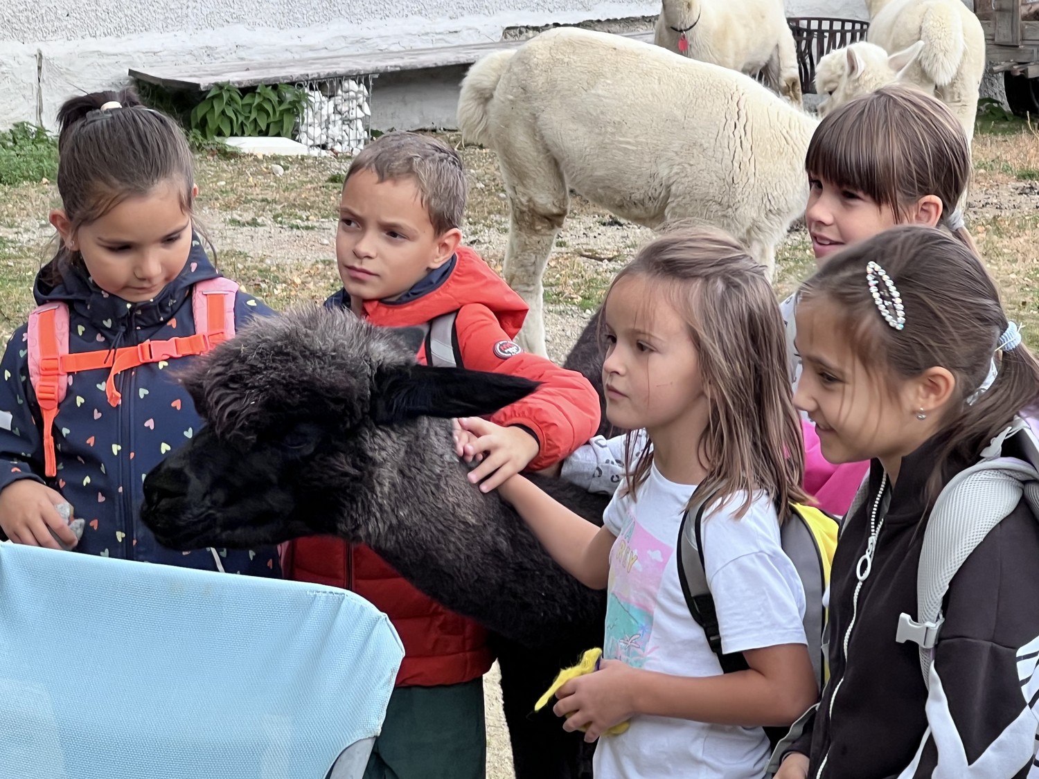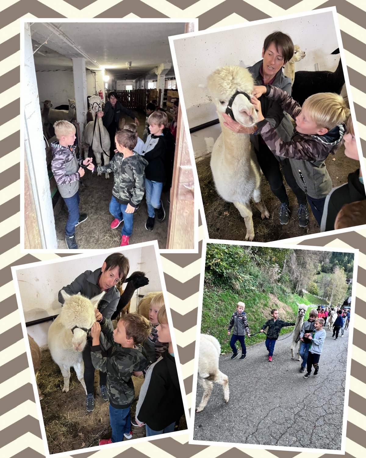 Die 2. Klassen besuchten die Alpakas am Wieserhof und durften viele neue Erlebnisse sammeln. Erst wurden die Alpakas gefüttert, danach für einen Spaziergang "aufgezäumt", spazieren geführt, gemeinsam gejausnet und zum Abschluss im Heu gehüpft und mit der Wolle der Alpakas Blüten gefilzt.